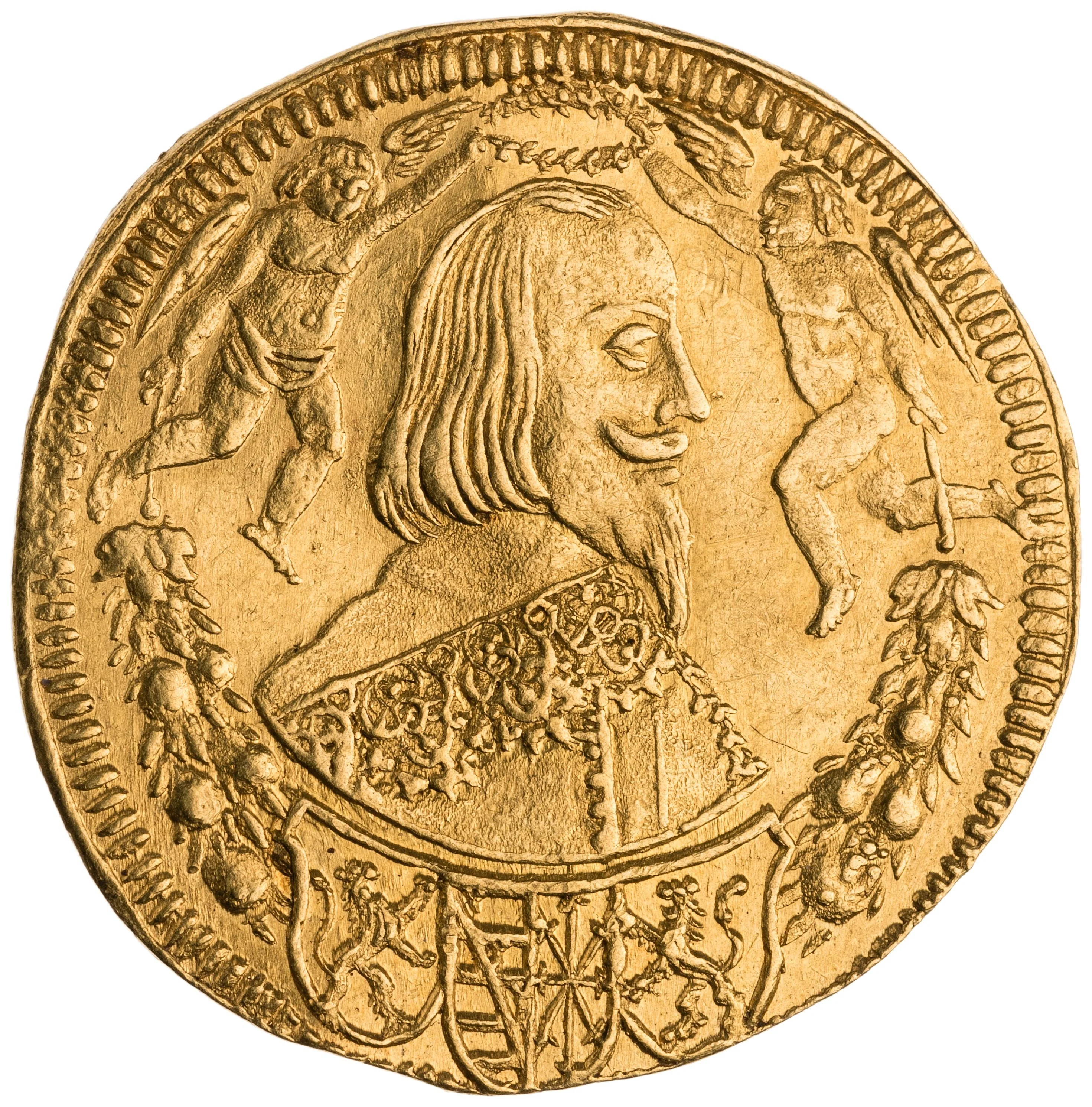 Right-facing bust, two genii with wreath above, three small armorial shields below.