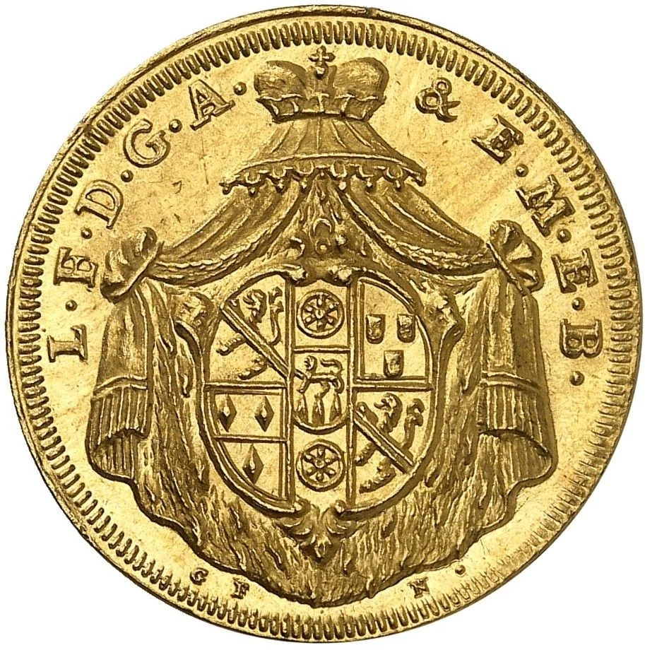 Crowned, draped arms.