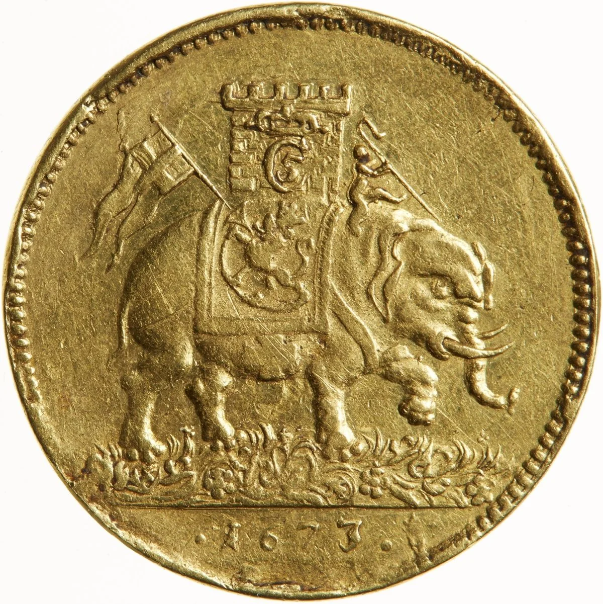 War elephant facing right on decorated ground. Crowned monogram of Christian V, crowned Norwegian lion facing left, rider with flag atop elephant. Date below ground. Beaded rim.