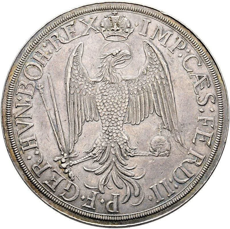 Eagle with spread wings, holding orb, sword, and scepter, bearing the titles of Ferdinand II.
