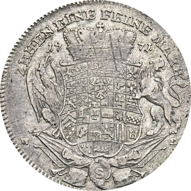 Crowned arms on flags and cannons, date above, mint official's initials below. Mint mark framed below, value above.