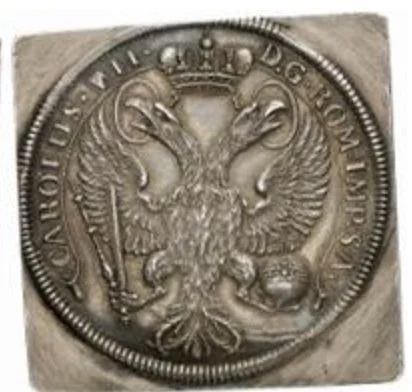 Imperial eagle holding orb and sword with scepter, encircled by a ribbon inscription.