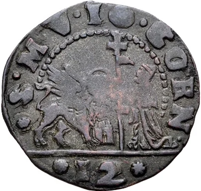 Lion of St. Mark left, kneeling doge right holding cross-topped staff with pennant; '12' in exergue.