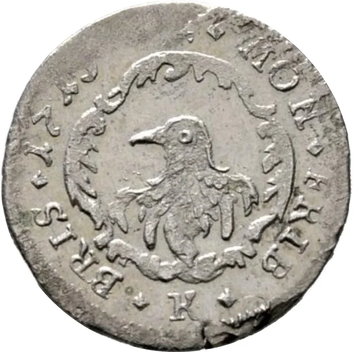 Raven head framed, 2 above, K below, dated legend.