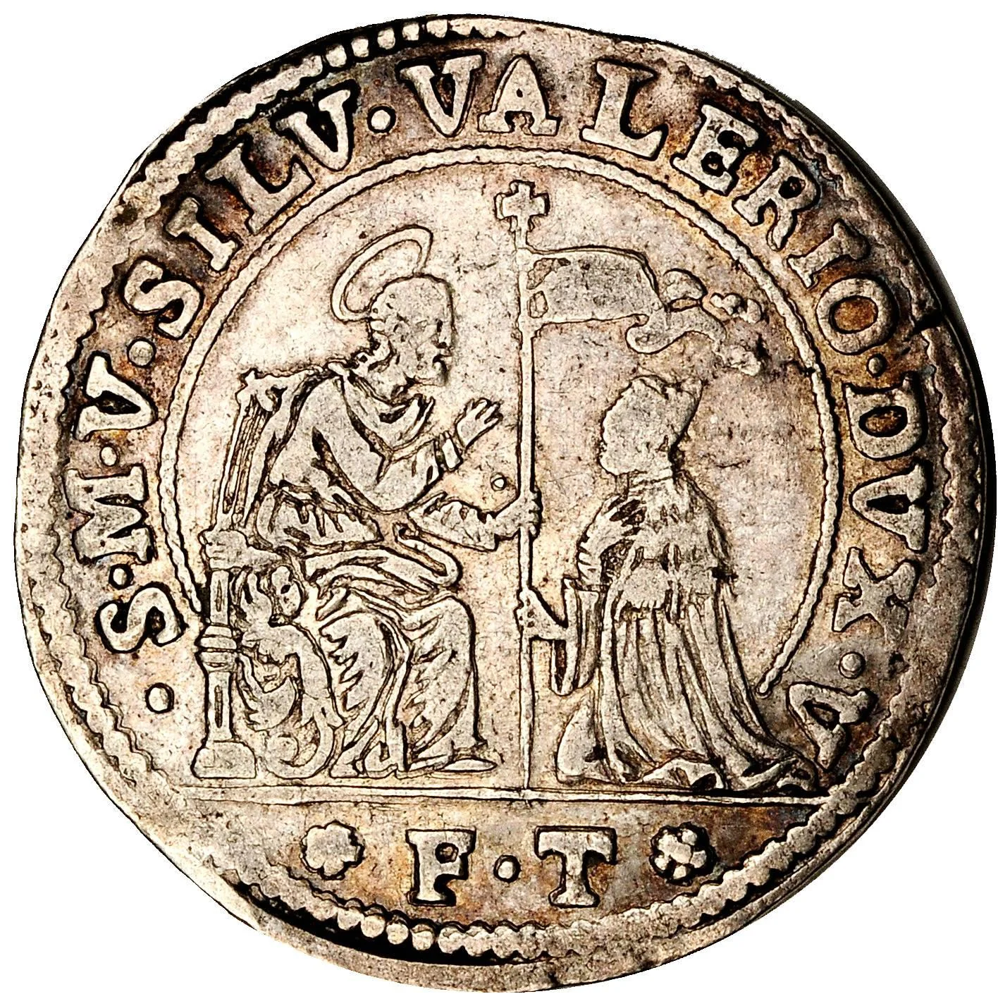 St. Mark gives a staff to the kneeling doge; mintmaster's initials below.