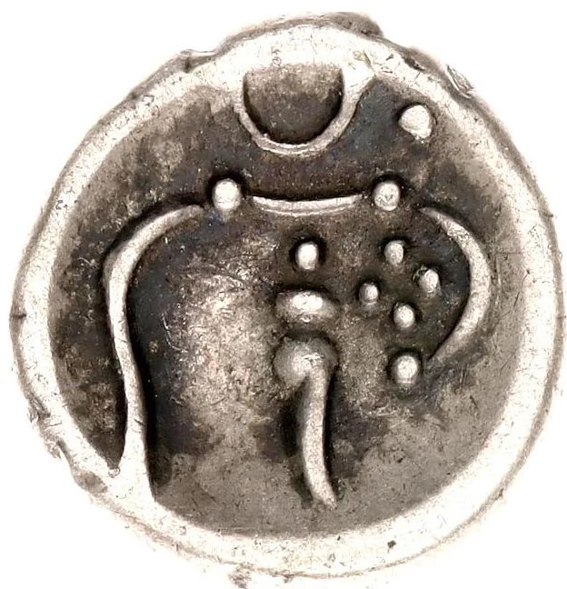 Lord Vishnu as Padmanabhaswamy beneath the VOC monogram, above three rows of four dots.