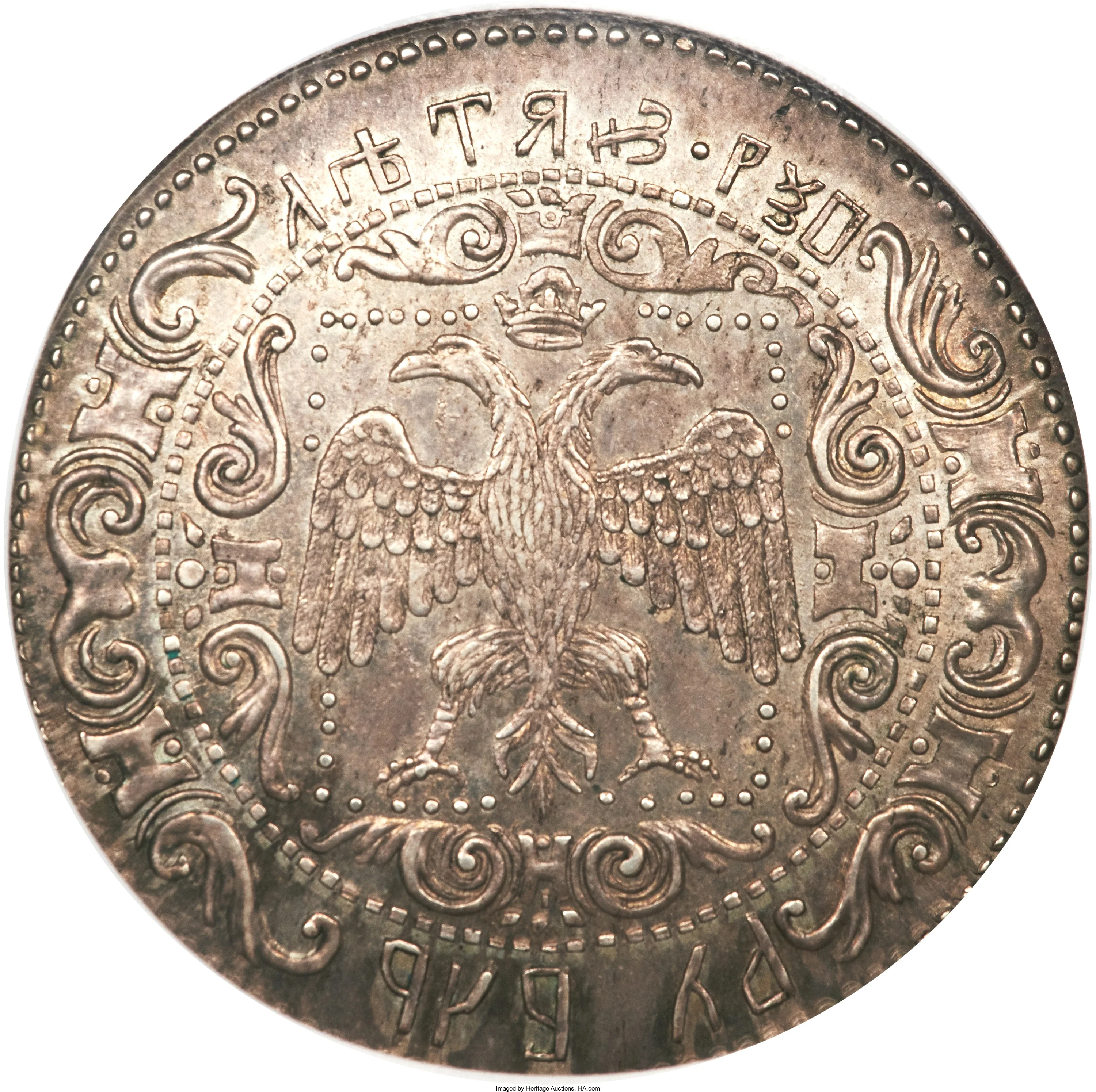 Double-headed eagle within ornate border and legend.
