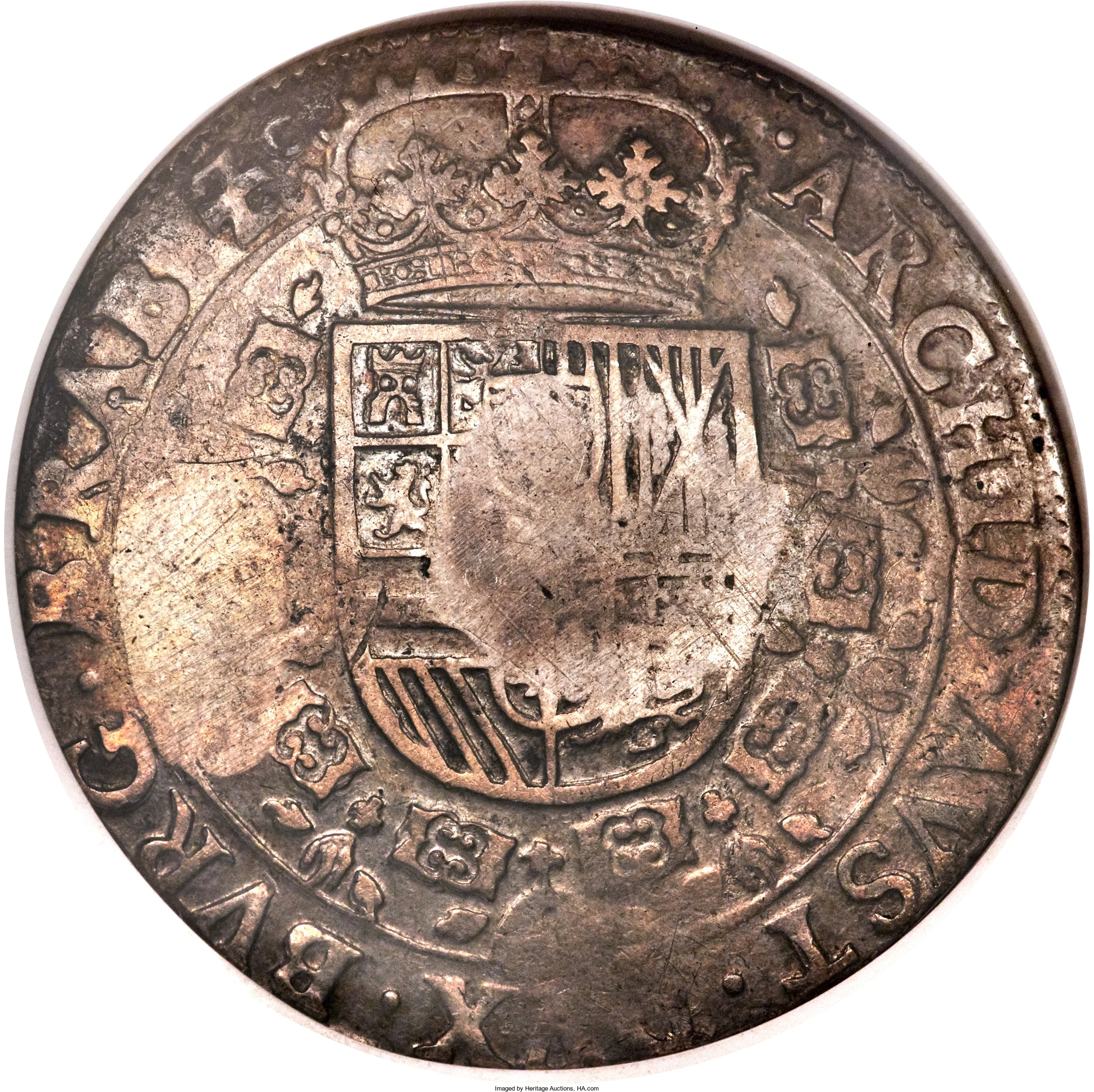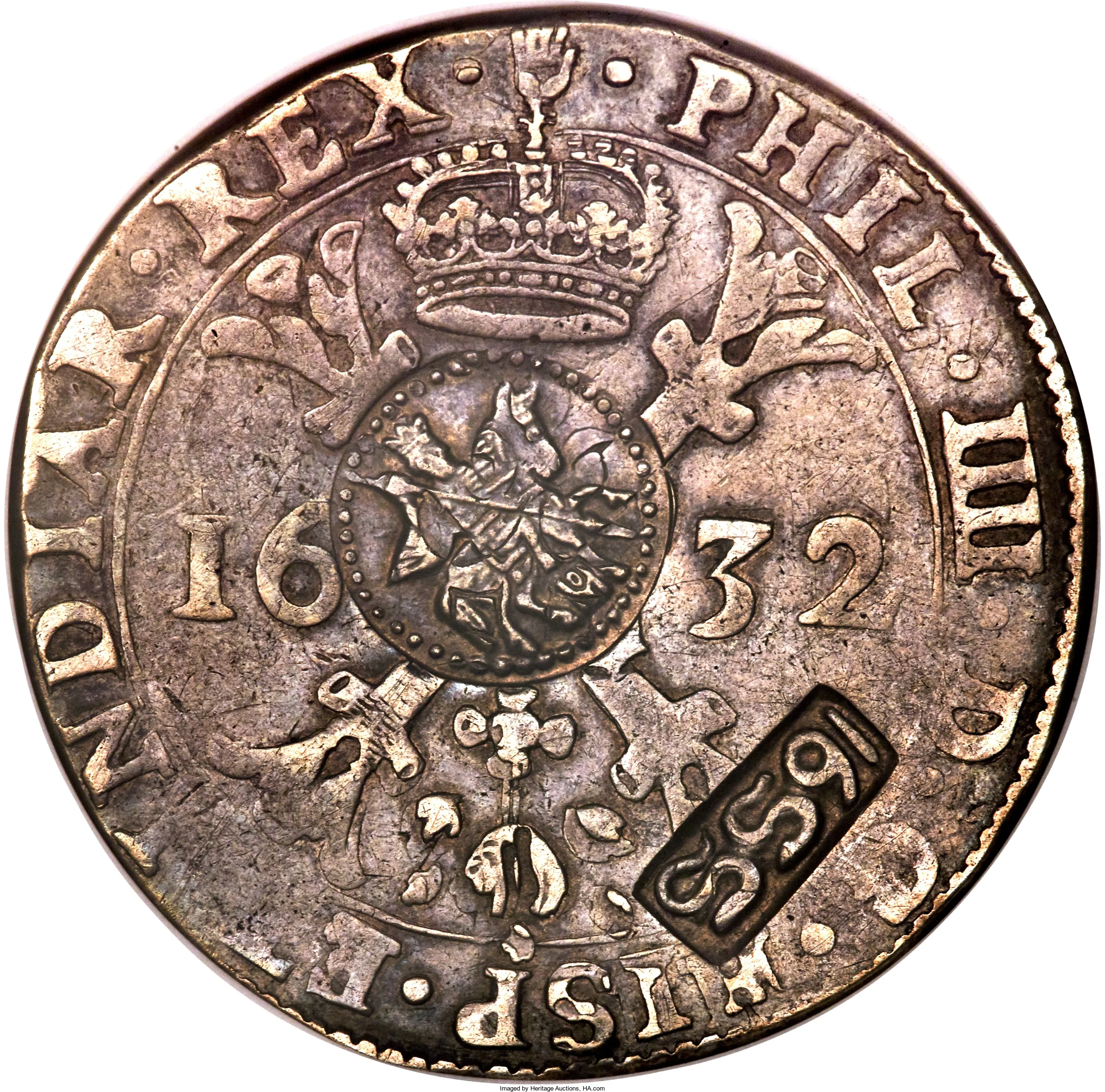 Jefimok Rouble counterstamp on a 1632 Brabant Patagon (Philip IV). Host coin: Spanish Netherlands Patagon (1621-1653). Counterstamp: horseman with spear and date.
