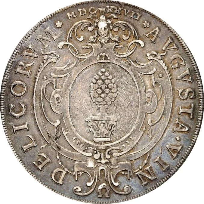 City arms in oval baroque frame, splitting Roman numeral date above a horseshoe, flanked by legend.