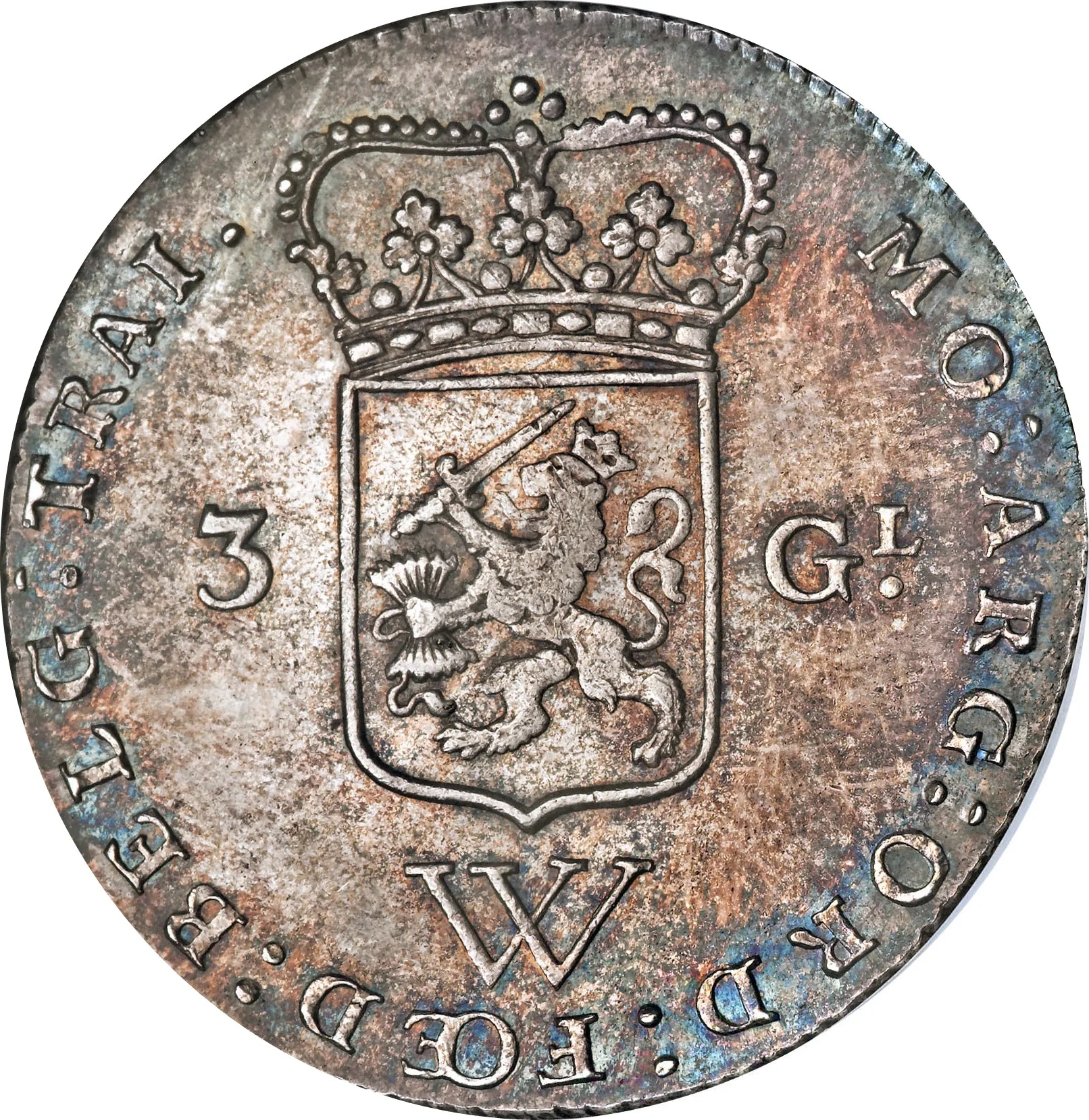 Crowned arms of the Dutch Republic's Generality, above its value, with a "W" for West Indies below. Abbreviated Latin text surrounds it.
