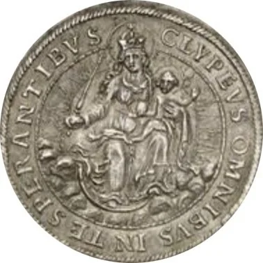 Madonna and Child seated on a crescent moon in clouds, holding a scepter, surrounded by rays. Head divides legend.