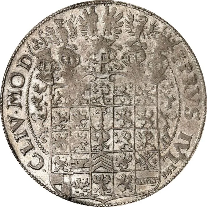 Helmeted arms, 24-fold, with mint official's initials below shield.