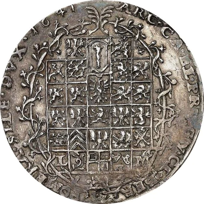 Arms quartered by mintmaster initials in wreath, date in legend.
