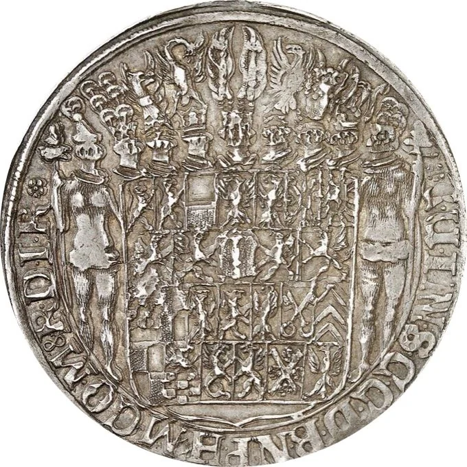 Helmeted wildmen support a shield with 25 crossed arms.