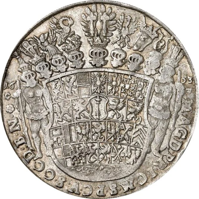 Helmeted wildmen support quartered arms, flanking date and mint initials.