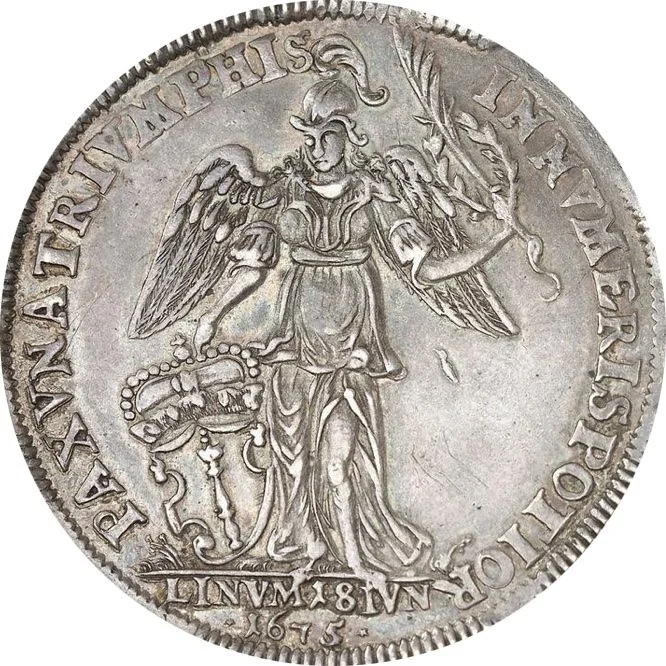 Helmeted Winged Victory with laurel wreath and palm branch on right, crowned scepter at left, date below.