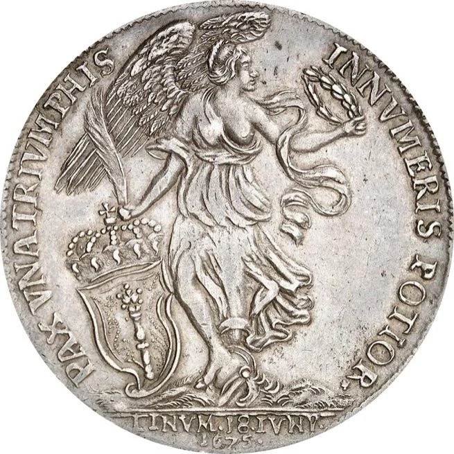 Winged Victory facing right, bare-chested, standing on a helmet. She holds a laurel wreath to the right, a palm branch and a crowned scepter to the left. Date below.