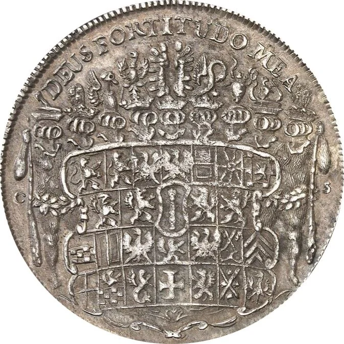 Arms with helmeted wildmen flank a shield dividing the mint initials.