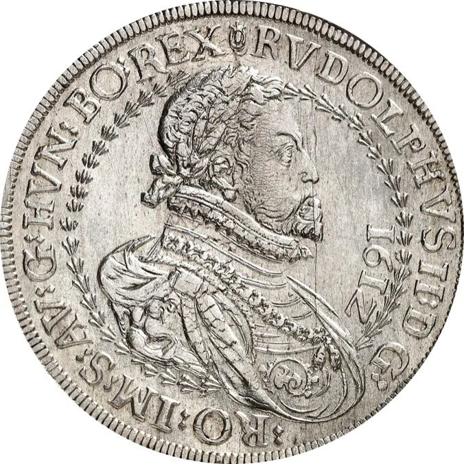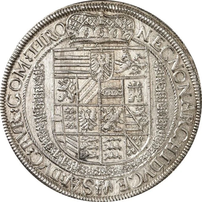 Description: Large round shield with a 16-part coat of arms, topped by the Tyrol shield and encircled by the Order of the Golden Fleece chain. The fleece hangs at the bottom, dividing the surrounding legend.