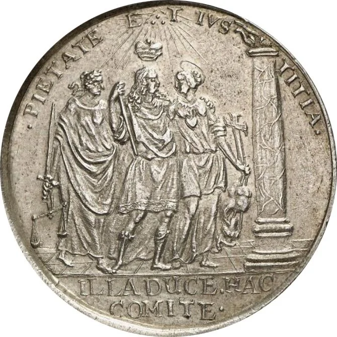 Margrave holding baton, crowned. Left: Justitia with sword and scales. Right: Pietas with cross and miter. Column beside her, radiant triangle above, inscription below.
