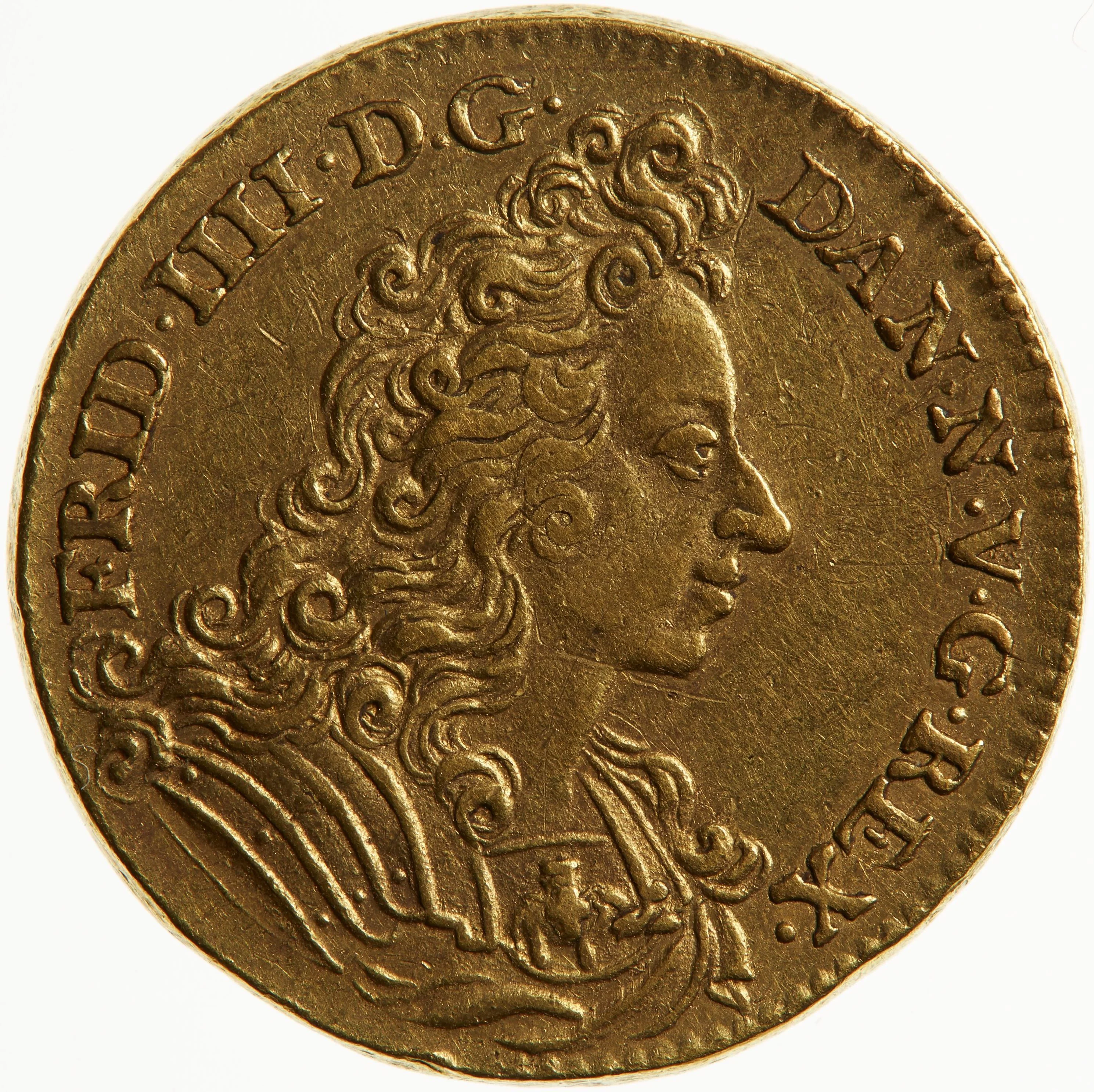 Bust of Frederick IV facing right, with long hair, ornate armor, and the Order of the Elephant.