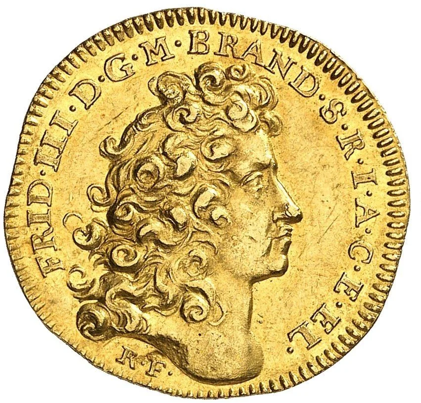 Crowned F III monogram with scepter, shield, and garter belt in cruciform; date above.