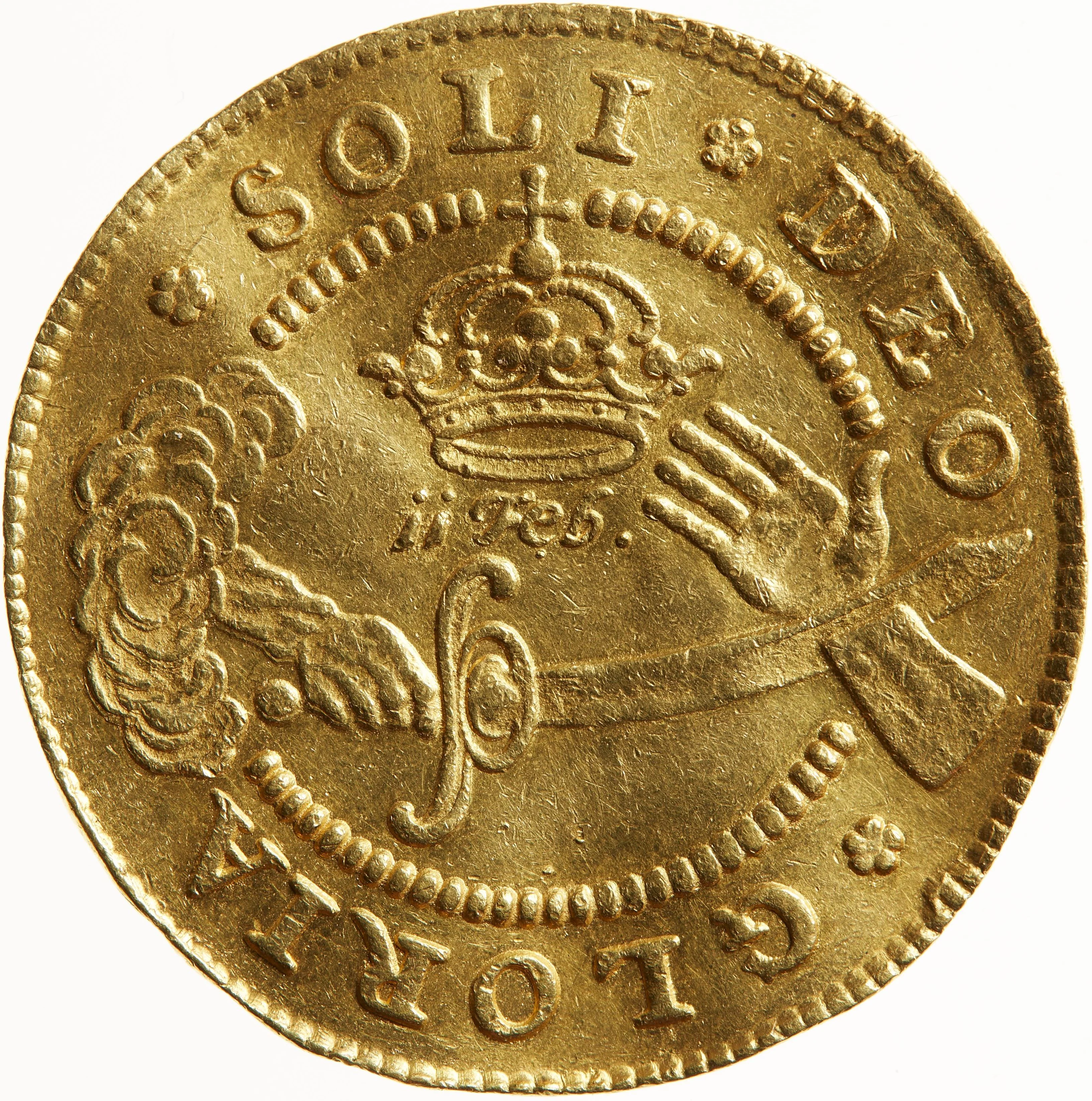 King’s monogram within a beaded circle, topped by a crown. A cloud inscribed "EBEN-EZER" breaks through the circle and crown below. The king’s motto and date surround the design.