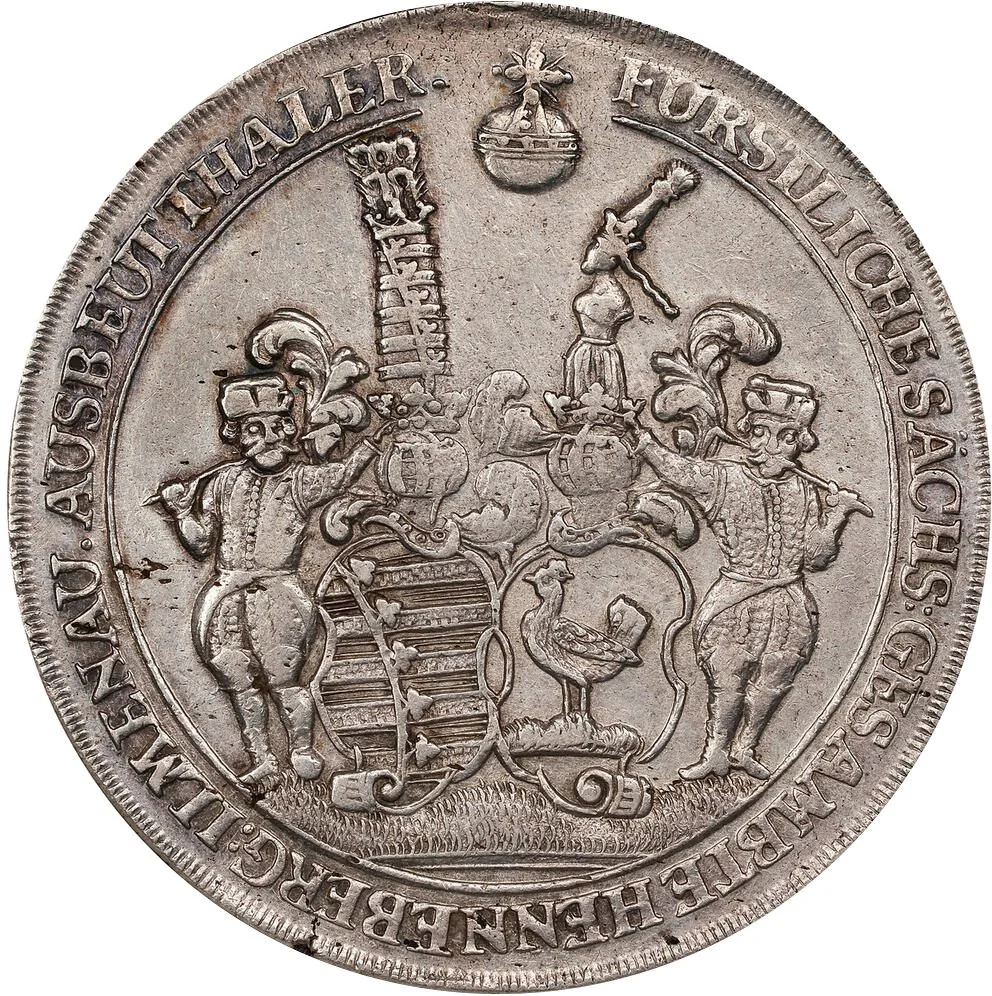 Two helmeted figures supporting the shields of Saxony and Henneberg, with an imperial orb above.