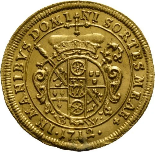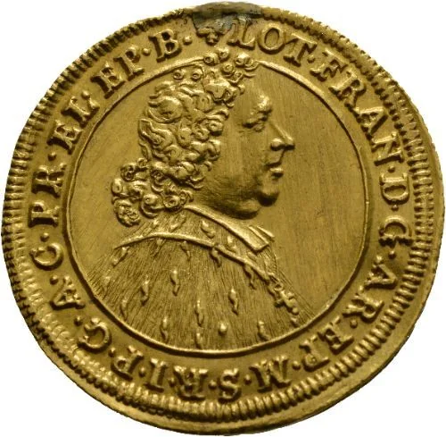Crowned oval shield with six arms and central Schonborn heraldry.