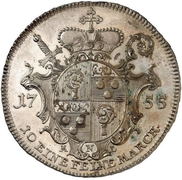 Crowned crest in baroque frame divides date, initials, mint mark, and value.