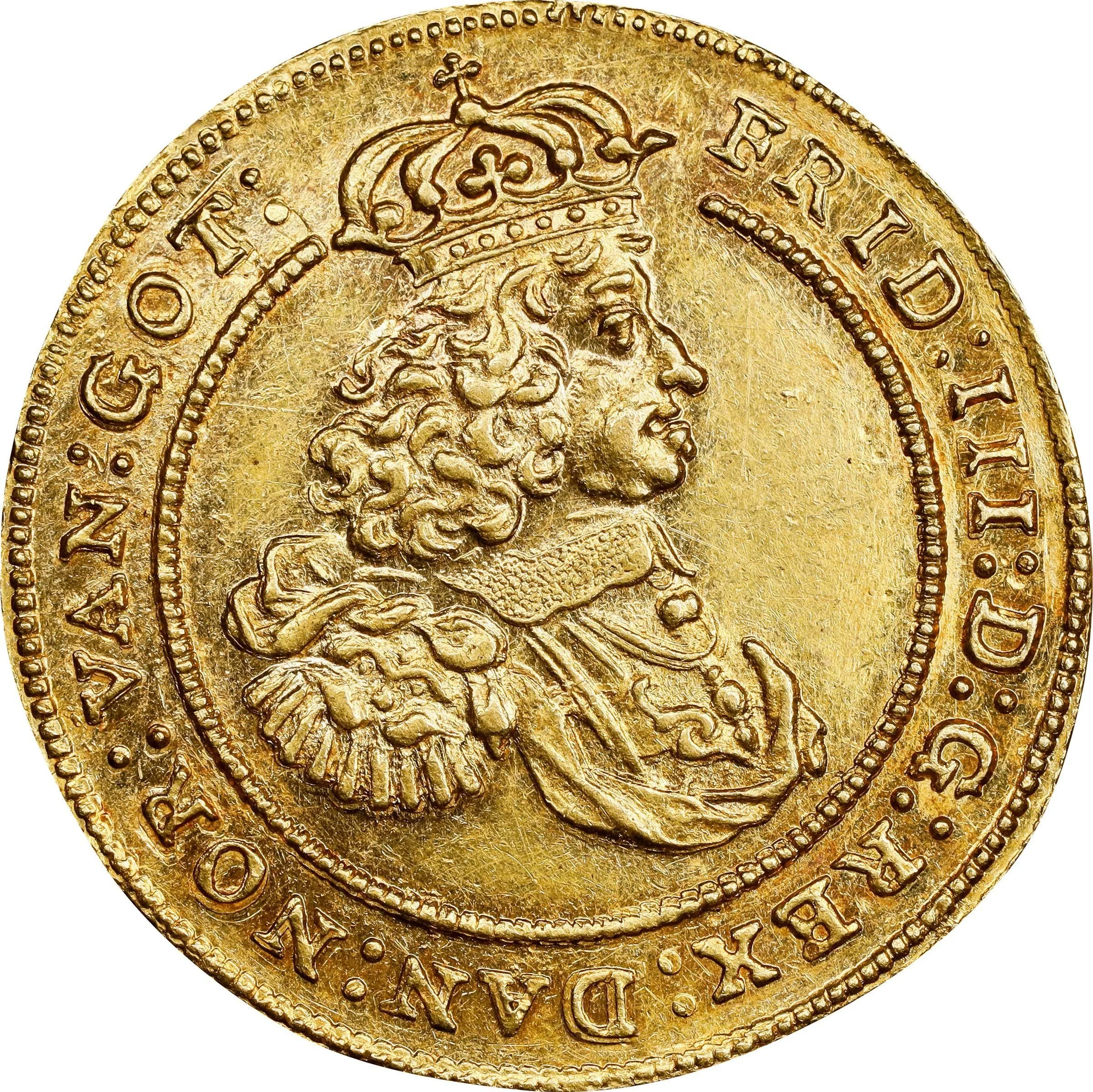 Right-facing crowned bust of Frederik III within a rope circle, interrupted above by his crown. Outer legend.
