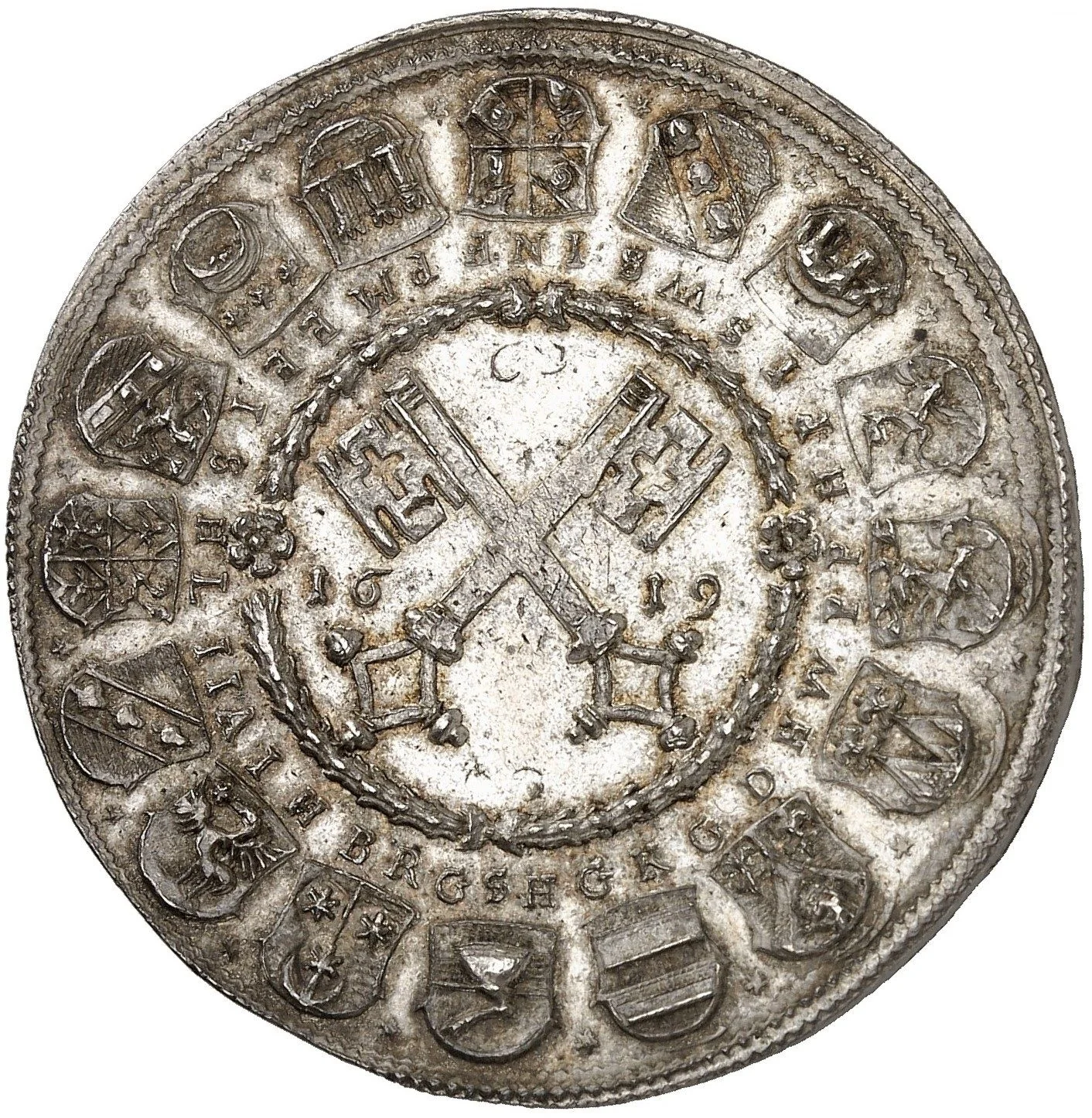 City arms above date within wreath.