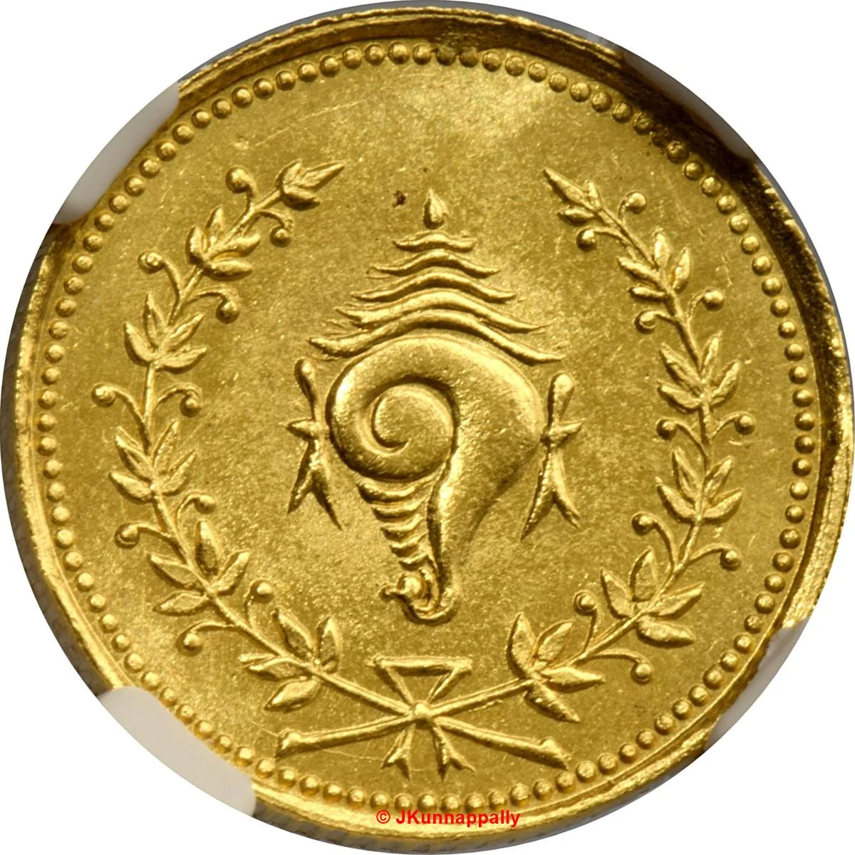 Conch shell in a wreath, ringed by beads.