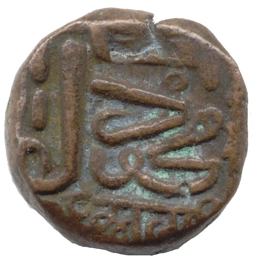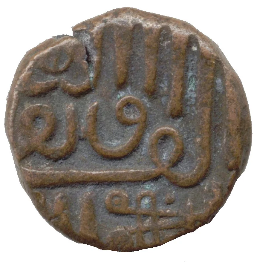 Obverse based on a coin of Mahmud III of Gujarat, featuring a dagger and Persian legend: 'Al wasiq billah al-minnan, Nasir-ud-duniya waud-din Abdul-fateh'.