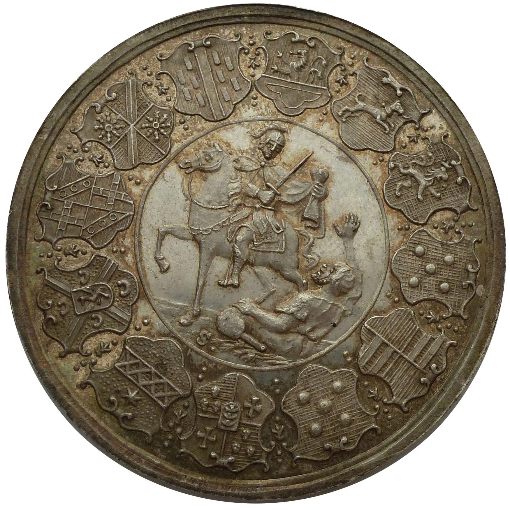 St. Martin on horseback, sharing his cloak with a beggar. Surrounding border of twelve coats of arms.