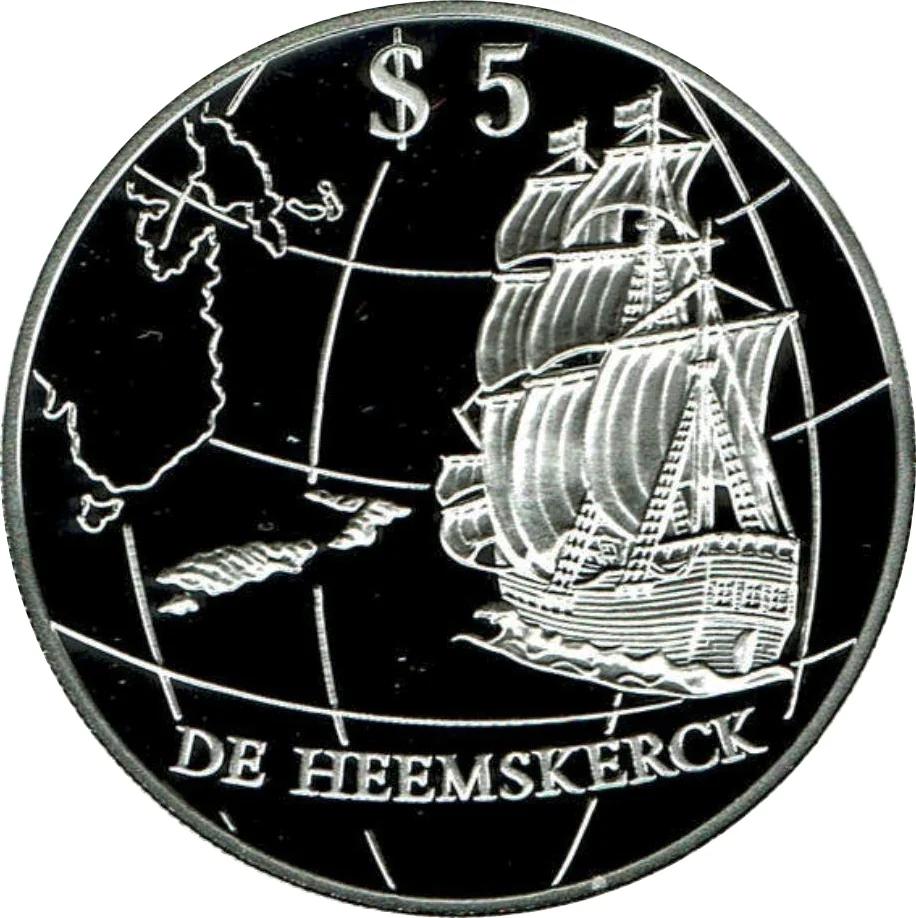 "De Heemskerck" ship on a globe featuring New Zealand and Australia.