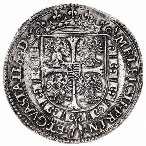 Shield quartered with central shield, encircled by the Golden Fleece collar. Date split by crown above.