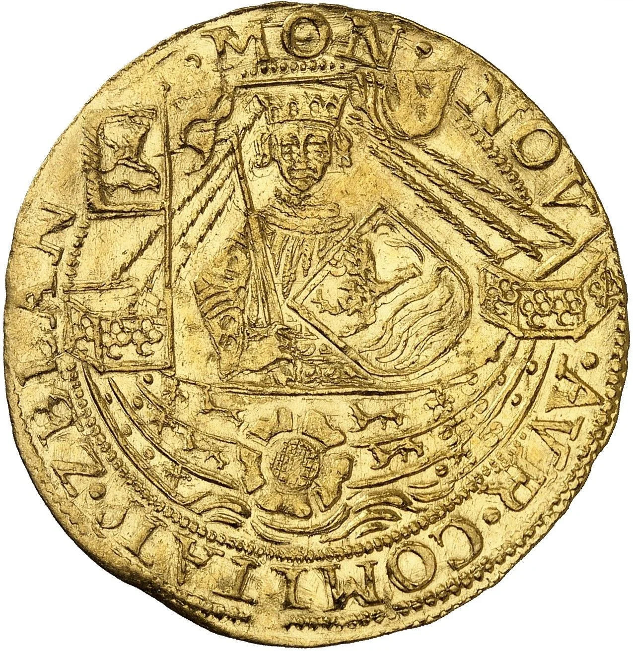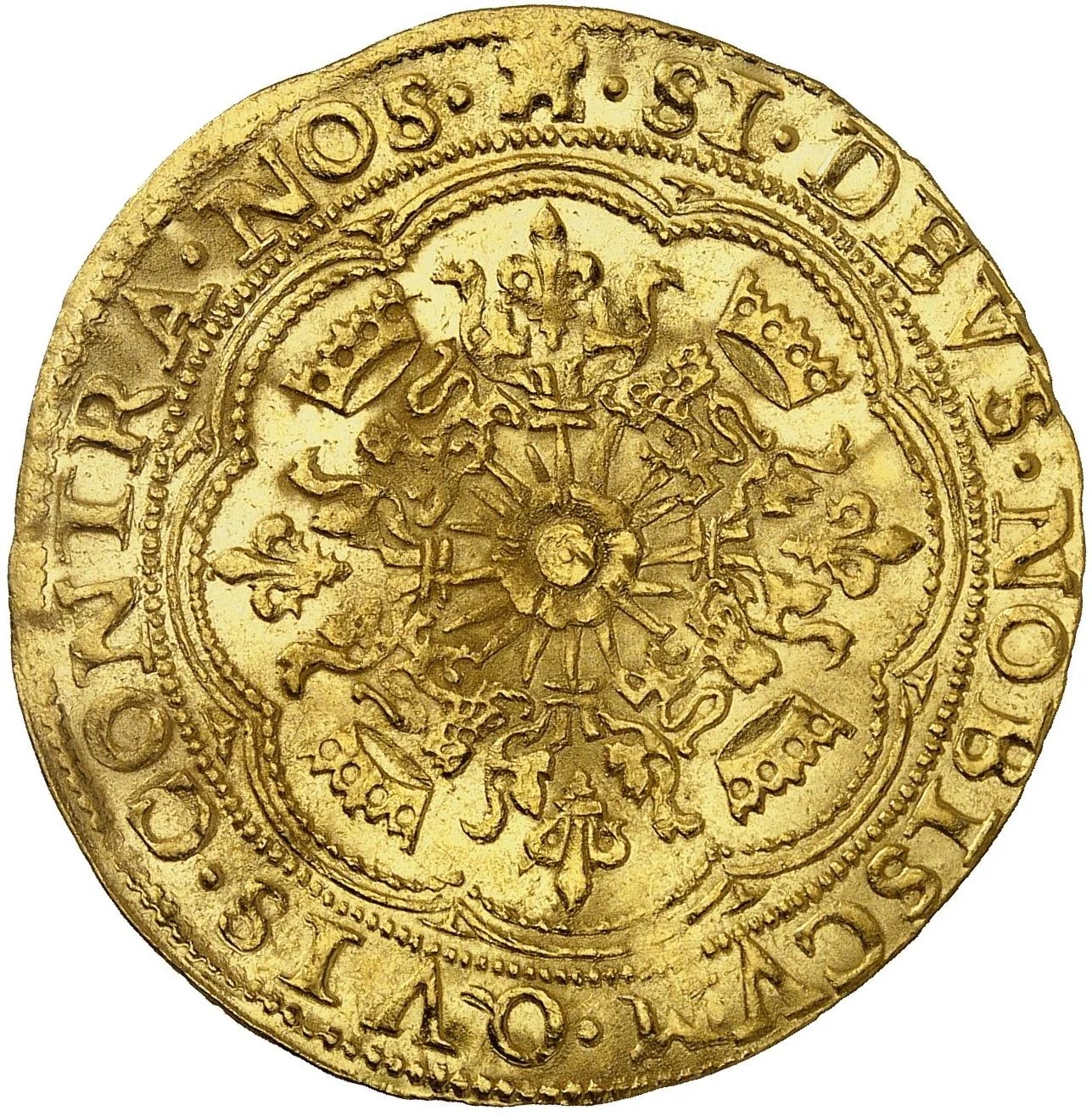 Cross fleurée with crowned lions in quarters, within a double octolobe; trefoils in spandrels.