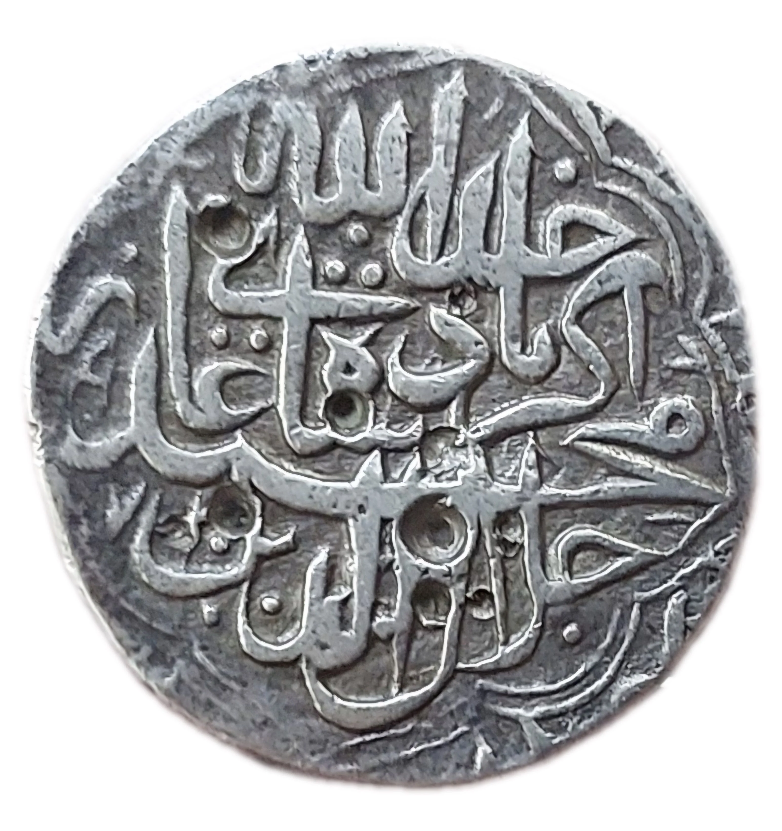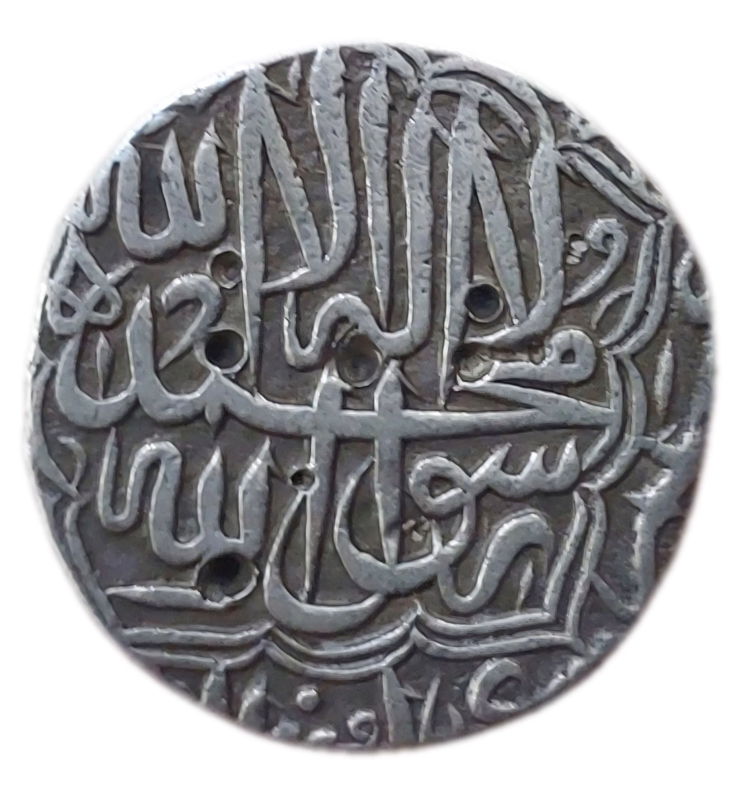 Arabic legend: Kalima Shahada in a double pentafoil, with the four Caliphs' names around the border.