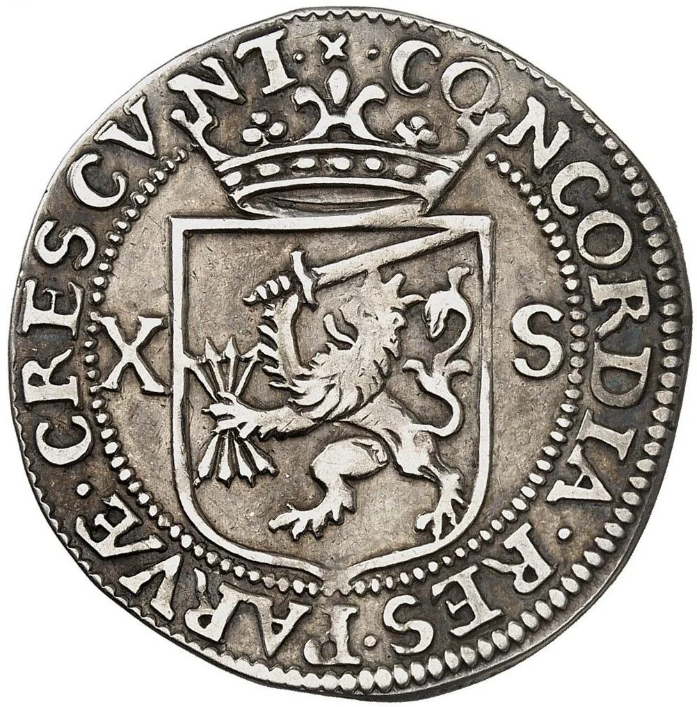 Arms of the United Provinces divide the value within a beaded circle.