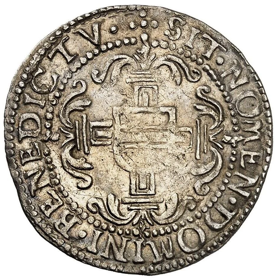 Floriate short cross, Groningen arms at center, within beaded circle.