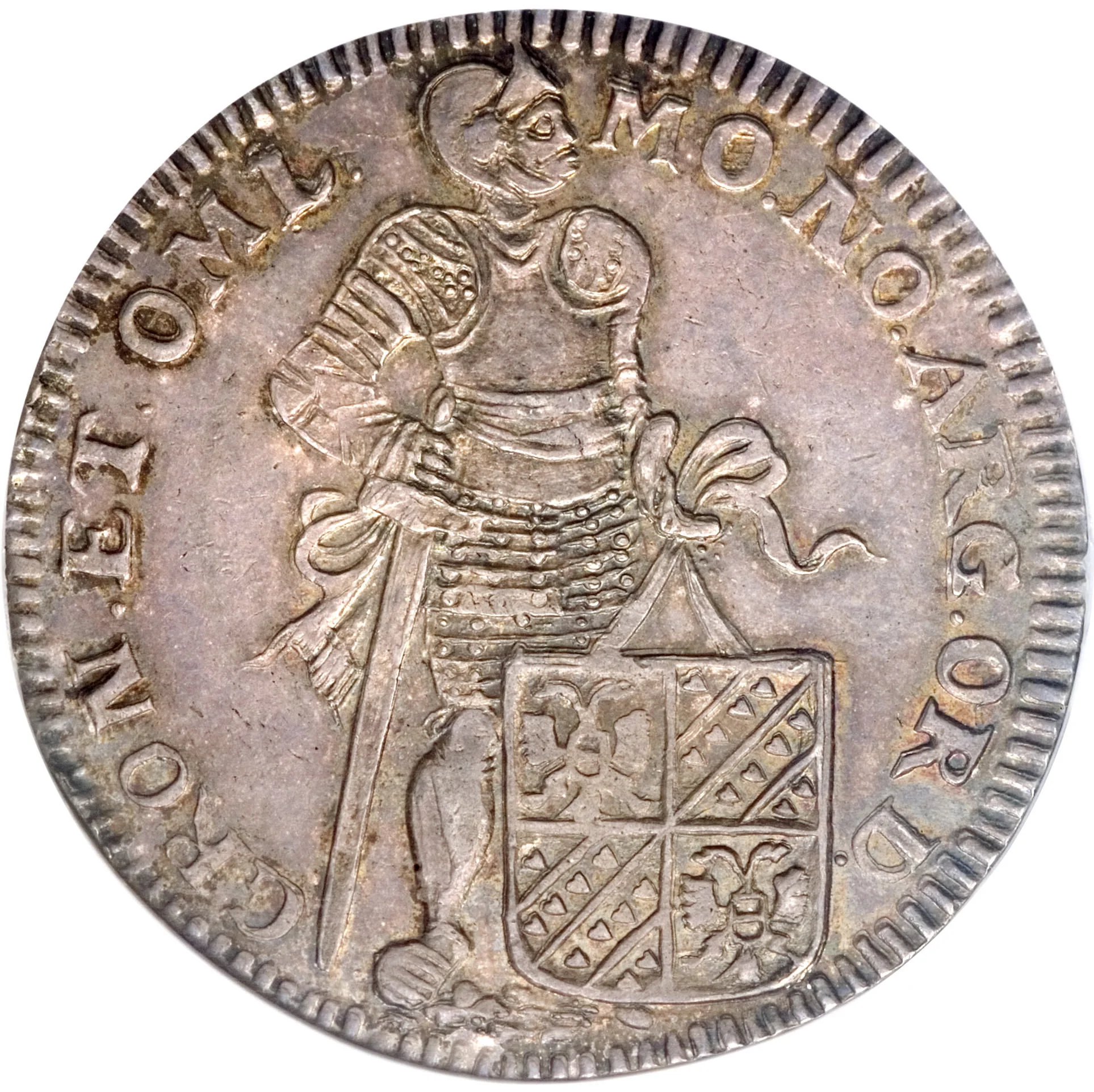 Knight in armor facing right, sword in right hand, ribbon in left, crowned Zeeland shield at feet.