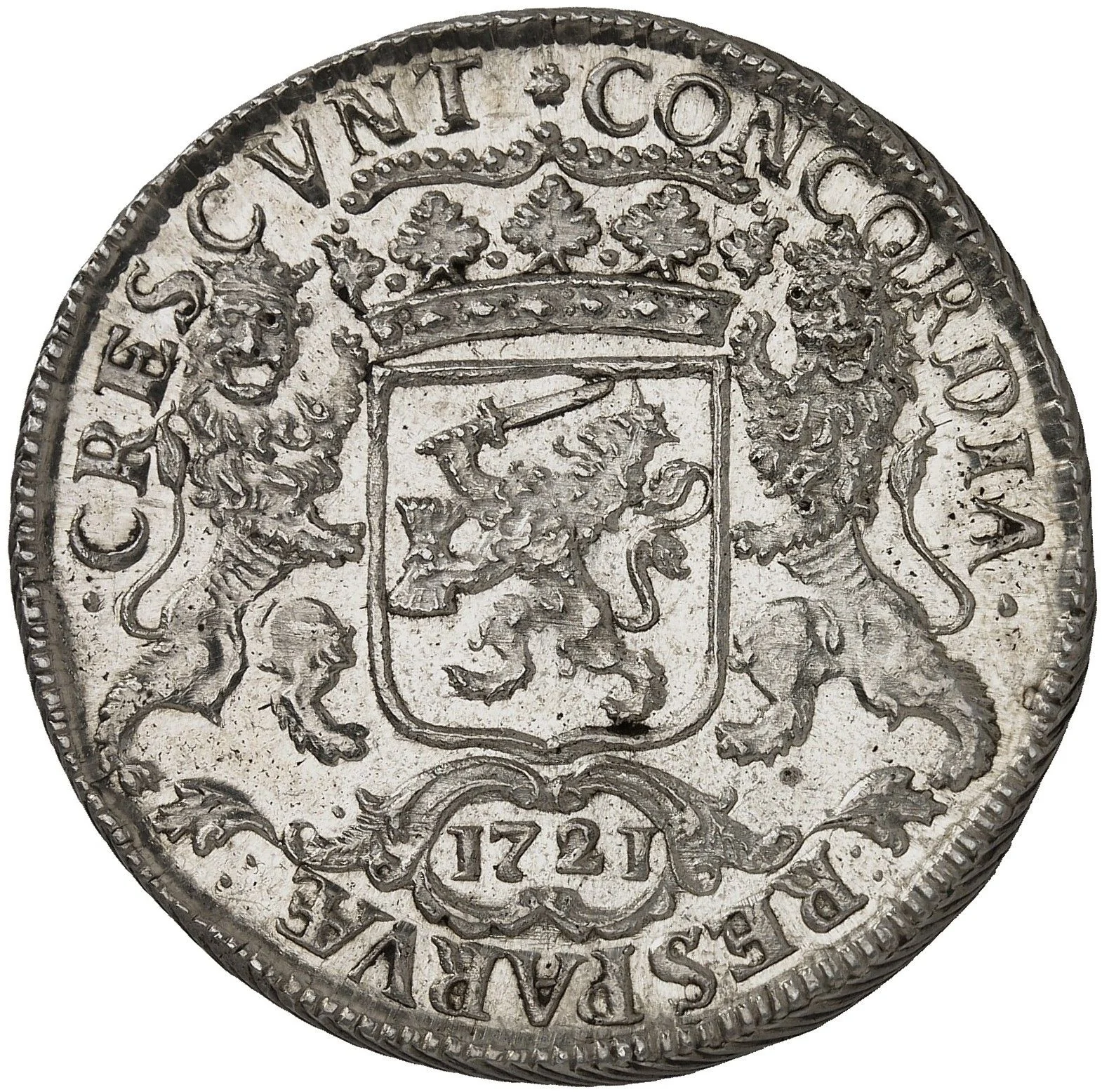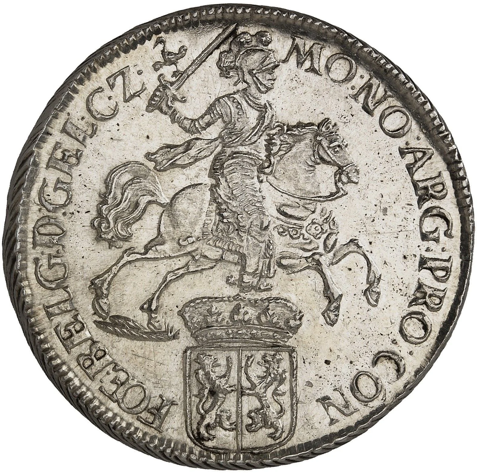 Armored knight on charging horse, brandishing sword above Gelderland arms. Legend ends with mint mark.