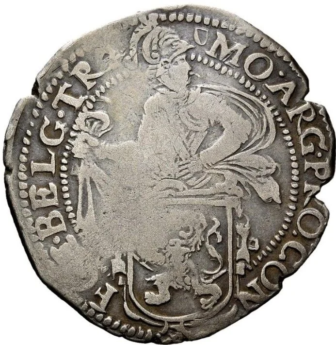 Knight in armor facing right, holding a ribbon, breaking the inner circle behind a shield of the Holland lion. Utrecht mint mark above.