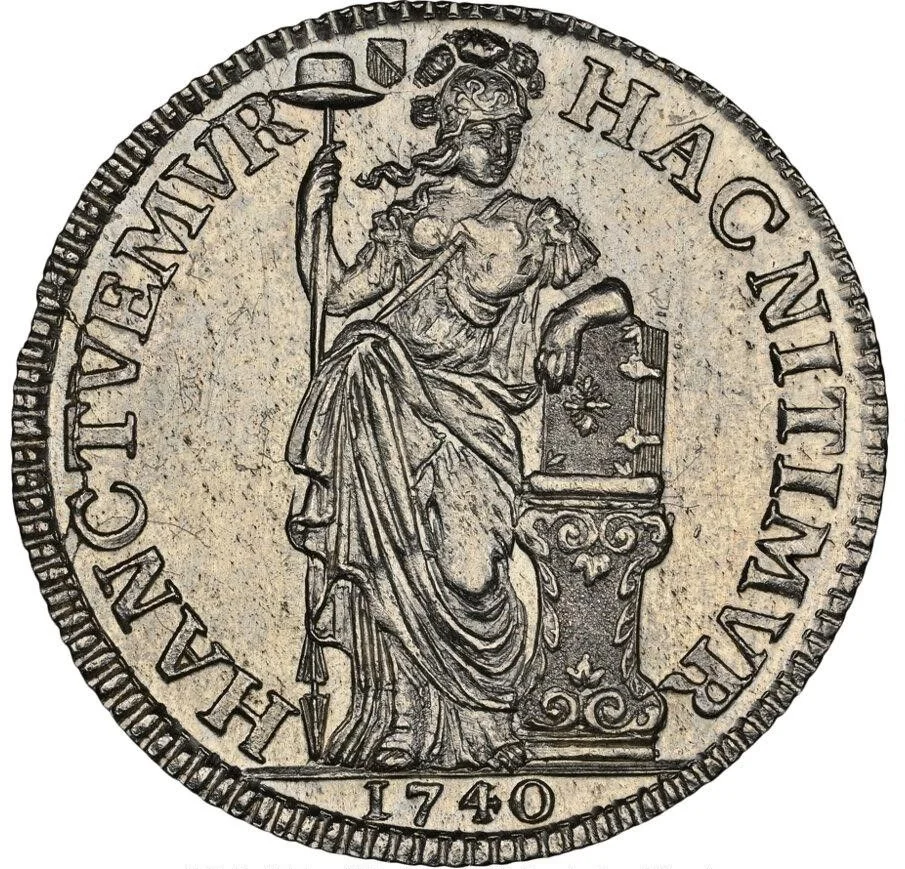 Figure leaning on a column, cap on a pole. Date below, legend ends with small Utrecht arms.