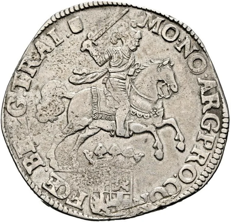An armored knight on a charging horse, holding a sword, above the crowned arms of Utrecht. The legend ends with the Utrecht mint mark.