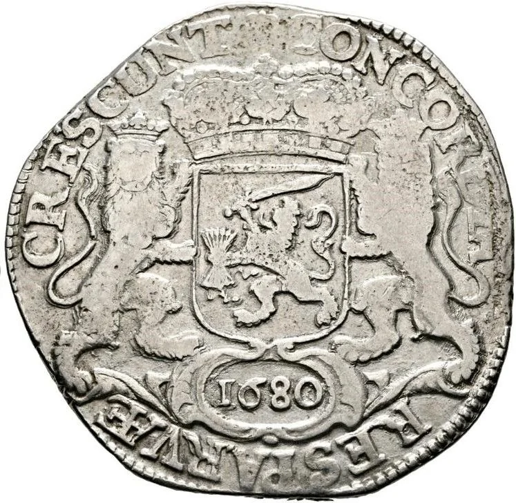 United Provinces' crowned arms flanked by forward-facing lions, date in cartouche, rosette privy mark above.