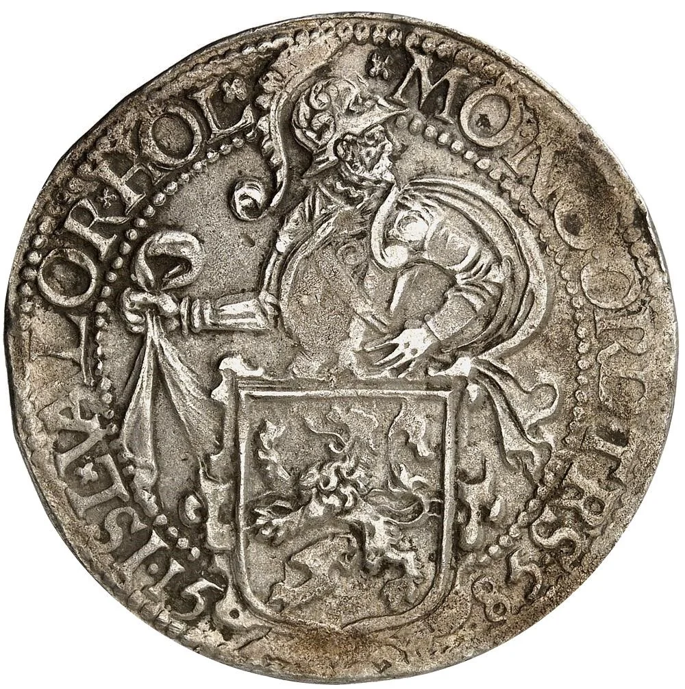 Knight facing right, holding a ribbon, behind a shield of Holland arms within a beaded circle. Date divided below shield.
