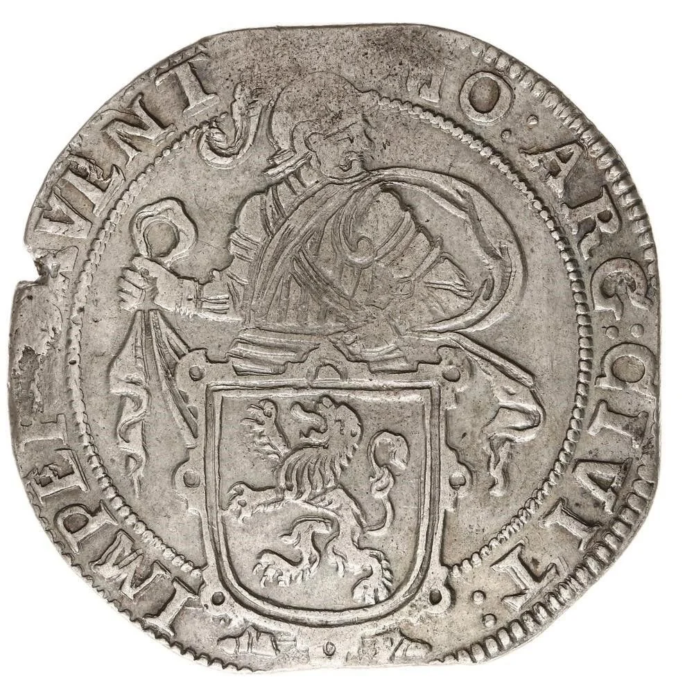 Armored knight facing right, holding a ribbon, behind Holland's coat of arms, within a dotted circle.