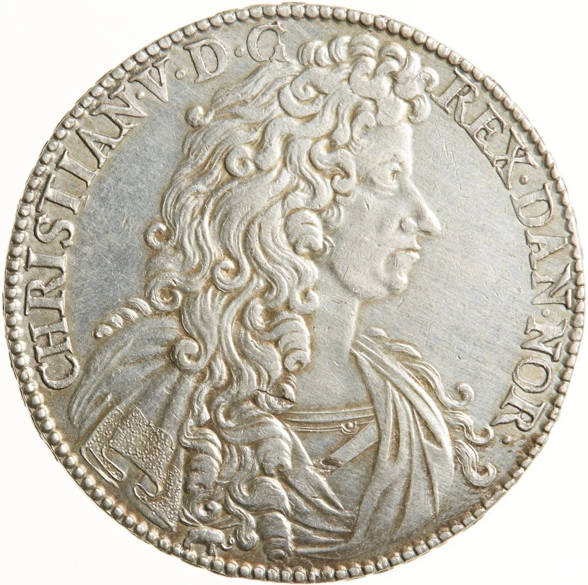 Bust of Christian V facing right, with long hair, an elephant symbol below, surrounded by inscription and a beaded rim.